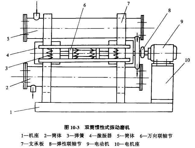 雙筒慣性式振動(dòng)磨機(jī)的構(gòu)造如圖10-3所示。它由機(jī)座1,筒體2,5,彈簧3,激振器4,萬(wàn)向聯(lián)軸節(jié)6,支承板7,彈性聯(lián)軸節(jié)8和電動(dòng)機(jī)9等組成。雙筒振動(dòng)磨機(jī)的粉磨筒體為串聯(lián)方式上下布置,它們之間通過(guò)文承板7互連在一起,而支承板由彈簧3支承在機(jī)座I上。在支承板中部裝有激振器,激振器主動(dòng)上裝有可調(diào)式偏心塊,激振器主鈾通過(guò)彈性聯(lián)軸節(jié)與電動(dòng)機(jī)相連接。當(dāng)電機(jī)通過(guò)彈性聯(lián)軸節(jié)帶動(dòng)主軸轉(zhuǎn)動(dòng)時(shí),偏心塊產(chǎn)生離心力使筒體產(chǎn)生振動(dòng),物料從上筒體5的—端給入,在筒內(nèi)受到粉磨介質(zhì)的激烈振動(dòng)沖擊磨剝作用粒度變小,并運(yùn)動(dòng)了筒體另一端,從排料門(mén)給入到筒體2進(jìn)行粉磨,粉磨達(dá)到產(chǎn)品粒度要求p則從下筒體的誹料口排出。當(dāng)產(chǎn)品粒度要求較粗時(shí),也可采用兩個(gè)筒體并列布置的方式,被磨物料僅通過(guò)一個(gè)粉磨筒體,則可獲得兩倍的臺(tái)時(shí)產(chǎn)量。