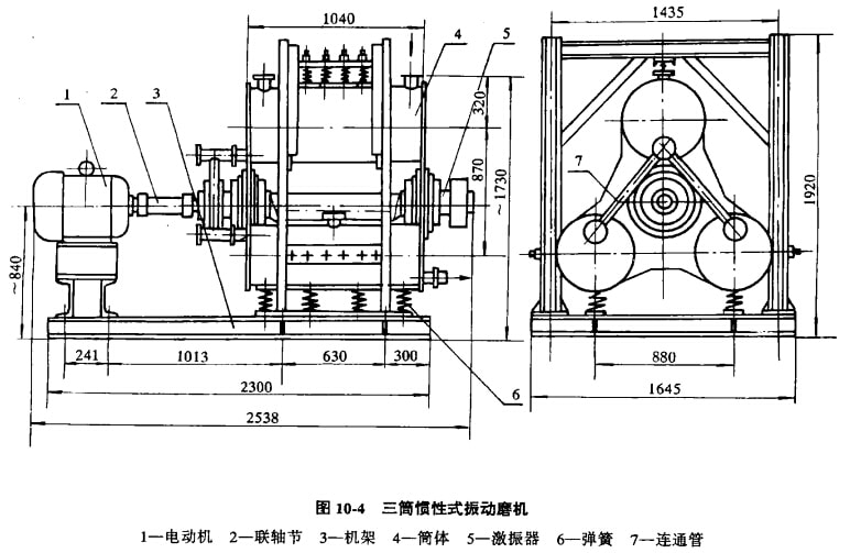 三筒慣性式振動(dòng)磨機(jī)的構(gòu)造如圖10-4所示。它由電機(jī)1、聯(lián)軸節(jié)2、機(jī)架3、筒體4、激振器5、彈簧6相連通管7等部分組成。振動(dòng)磨機(jī)的筒體由三個(gè)圓筒和兩塊側(cè)板構(gòu)成,通過(guò)兩側(cè)板將較大的上圓筒φ400 xl040和較小的兩個(gè)下圓筒φ320 xl040串聯(lián)在一起,而兩個(gè)下圓筒彼此互成并聯(lián),各圓筒內(nèi)壁上均鈕有襯板,以防筒壁磨損。激振器主要由偏心軸、可調(diào)式偏心塊、鑄鋼軸承座、雙列調(diào)心滾子軸承和迷宮式密封環(huán)等組成。電機(jī)1通過(guò)彈性聯(lián)軸節(jié)2帶動(dòng)激振器5的偏心軸及安裝在軸兩側(cè)的偏心塊旋轉(zhuǎn),產(chǎn)生離心力,從而使坐落在彈簧上的筒體產(chǎn)生高頻小幅振動(dòng)。物料和水不斷地從上圓筒的給料口加入,物料在筒內(nèi)粉磨介質(zhì)的頻繁沖擊和研磨作用下被磨細(xì),完成第一段粉磨,而后經(jīng)過(guò)排料連通管分別流入下部?jī)蓚(gè)小圓筒內(nèi)進(jìn)行第二段粉磨,粉磨好的合格產(chǎn)品從小圓筒的排料口排出。整個(gè)粉磨作業(yè)為連續(xù)作業(yè)。