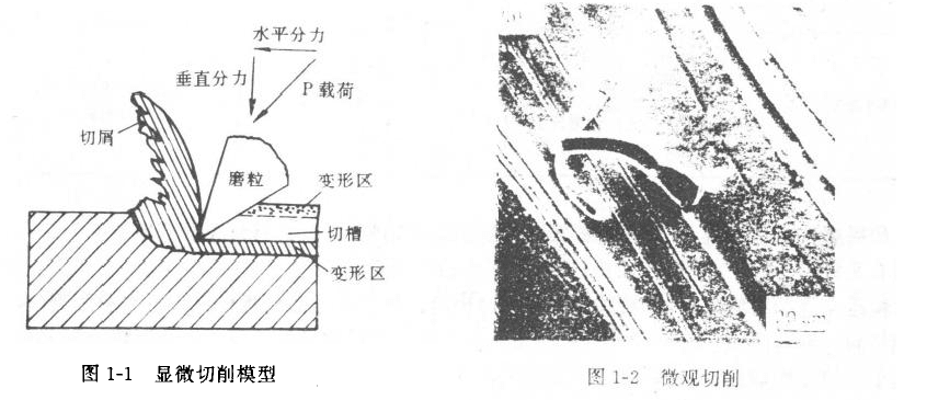 磨粒作用在金屬材料表面上,磨料上承受的就荷P可分為法向分力都切向分力。在法向分力作用下,磨料的棱角刺入材料表面,在切問分力作用下,磨粒沿平行于表面方向滑動(dòng),帶有銳利棱角并具有合適的迎角的磨粒能切削材料而形成切屑(見圖1-1)。圖1-2是一典型的磨粒切削材料而形成顯微切屑過程的照片?梢钥闯觯行既匀涣⒃诘嫔,黑色的磨粒仍然鑲嵌在切屑的根部。磨粒切削過程使材料表面產(chǎn)生某種校度的理性變形,圖1-2上還可以看到劃痕兩邊戲留的剪切皺折。這種切削過程與機(jī)加工過程產(chǎn)生的切屑極為相似,只是體積小些、故稱為微觀切削。