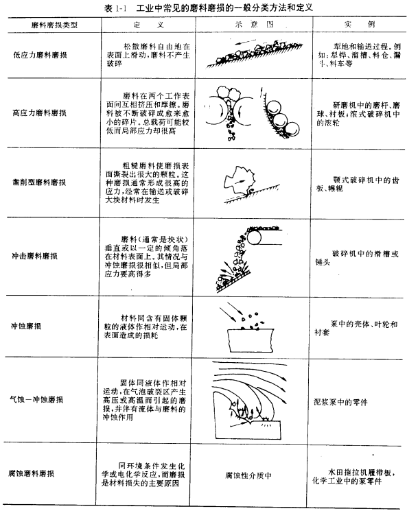 由粗糙硬表面把較軋的工作表面劃傷,或者工作表面受外界硬粒劃傷,都用于磨料磨損。在礦山機(jī)械、工程機(jī)械、農(nóng)業(yè)機(jī)械等行業(yè)戶與泥沙、礦石或灰渣等立按摩擦。都會(huì)發(fā)生不同形式的磨料磨損。據(jù)統(tǒng)計(jì),因磨料磨損而造成的損失占整個(gè)工業(yè)范圍磨損損失的50%。對(duì)磨料磨損的分類很多文獻(xiàn)都習(xí)慣引用Avery和Rigney的分類法(見表1-1)。