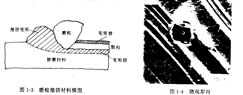 如果磨粒不夠尖銳,或刺入材料表面角度不適合切削,則會(huì)將材料表面擠出犁溝。犁溝變形有兩種:一種是由于磨粒推擠材料,使之堆積在廟版運(yùn)動(dòng)的前方,當(dāng)堆積增高后就會(huì)阻礙磨粒運(yùn)動(dòng)直到磨粒破碎,或被其他磨粒破碎帶走。第二種是磨粒將材料擠向溝槽兩側(cè)(也可能擠向一側(cè)),圖l-3所示為帶有負(fù)前角的磨版推擠材料的模型。圖1-4是磨粒推擠材料形成犁溝的過程照片。磨粒犁溝材料表面并不能一次產(chǎn)生磨屑,而是當(dāng)?shù)谝粋(gè)磨粒推擠材料表面形成犁詢后,已經(jīng)使溝榴底部或溝槽兩側(cè)金屆發(fā)生—“定程度的塑性變形,后繼的磨?赡芮邢鹘饘倩蚶^續(xù)推擠已經(jīng)發(fā)生理性交形的犁溝構(gòu)底或兩側(cè),當(dāng)磨粒多次使金屬變形且變形程度超過材料允許的延伸極限后,變形材料表面就會(huì)產(chǎn)生裂紋,裂紋擴(kuò)展,形成薄片狀磨屑,這一磨損過程被稱為微觀犁溝(圖1-4)。