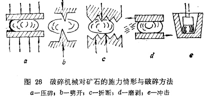 破碎機(jī)械對(duì)礦塊破碎的施力方式通常有壓碎、劈開、折斷、 磨剝及沖擊等幾種,詳見圖26所示。但作為磨礦機(jī)這種借助運(yùn)動(dòng)介質(zhì)產(chǎn)生破碎力的機(jī)械,能夠?qū)崿F(xiàn)的破碎方法主要是沖擊及磨剝兩種,當(dāng)然也存在壓碎(棒磨機(jī)具有)及劈碎(自磨機(jī)的環(huán)形波峰襯板具有)作用,但目前磨礦機(jī)中的破碎力形式主要還是沖擊力及剪切力。