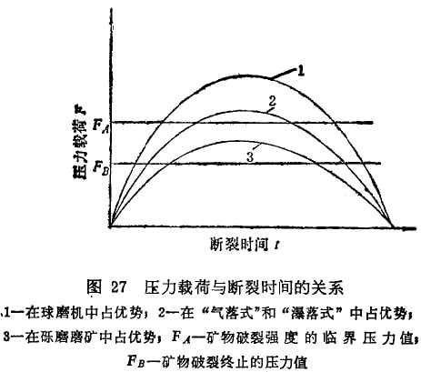 可見,施加大的載荷時(shí)斷裂的時(shí)間增加,選擇性破碎作用減弱; 施加小的載荷時(shí),斷裂的時(shí)間縮短,選擇性破碎作用增強(qiáng),這時(shí)只有易斷裂的地方才會(huì)斷裂。圖27曲線1是施以較大載荷的情況, 破裂的時(shí)間長(zhǎng),選擇破碎作用差,(載荷較大的情況在球磨機(jī)中占優(yōu)勢(shì)),曲線3是施以較小載荷的情況,破裂的時(shí)間短,只有沿易碎(較弱)的礦物處才會(huì)破裂,選擇破碎作用強(qiáng)(在礫磨機(jī)中載荷較小的情況占優(yōu)勢(shì)),曲線2是施以中等載荷的情況,破裂的時(shí)間比大載荷短而比小載荷長(zhǎng),破碎的選擇性比大載荷好而比小載荷差(載荷中等的情況在自磨機(jī)中占優(yōu)勢(shì))。由三種載荷的破碎特性可知:球磨機(jī)磨礦是選擇性破碎作用最差的磨碎過程;礫磨機(jī)及自磨機(jī)磨礦則具有較強(qiáng)的選擇磨碎作用,礦物之間沿結(jié)合面解離的情況比球磨機(jī)多。