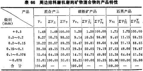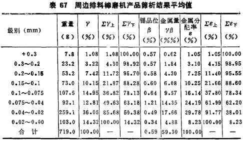 例如,用1~0.5mm的純石英及純磁鐵礦混合物(兩種礦物各占50%)在中心排料球磨機(jī)及周邊排料棒磨機(jī)中進(jìn)行磨碎試驗(yàn),結(jié)果列入表65及66。從表65及66的結(jié)果可以計(jì)算出,中心排礦時(shí)石英產(chǎn)品的平均粒度為0.56mm,磁鐵礦產(chǎn)品的平均粒度0.292mm, 二者的粒度差為1.93倍,兩種礦物一200目的產(chǎn)率差高達(dá)30.14%;而周邊排礦時(shí)石英產(chǎn)品的粒度為0.15mm,磁鐵礦產(chǎn)品的粒度0.146mm, 二者粒度僅差1.04倍,兩種礦物極為接近,而且兩種礦物一200目的產(chǎn)率也僅差0.71%。在中心排料磨礦機(jī)內(nèi),礦料的選擇磨碎作用是加速大密度軟礦物的磨碎速度,并拉大軟硬礦物的粒度差;而在周邊排料磨礦機(jī)內(nèi),礦料的選擇磨碎作用則是減緩大密度軟礦物的磨碎速度,并縮小軟硬礦物的粒度差。這就是說(shuō),中心排礦方式對(duì)回收礦物密度大、且礦物 硬度低的礦石不適宜,而周邊排礦磨礦機(jī)正好相反,它對(duì)回收脆 性和大密度礦物有利,具有保護(hù)脆性和大密度礦物少遭過(guò)磨及過(guò)粉碎的強(qiáng)烈作用。例如,鎢礦石、錫礦石及銻礦石的磨礦,采用為了證明周邊排礦磨礦機(jī)在生產(chǎn)上應(yīng)用的可能性,采用實(shí)際礦石進(jìn)行開(kāi)路磨碎試驗(yàn)。試料選用云南某廠錫石硫化礦石,其中大密度且脆性大的礦物為錫石,硬度大的脈石礦物主要為輝石 (密度比錫石小得多),礦石破碎至3~0mm后在周邊排料棒磨機(jī)及中心排料棒磨機(jī)中進(jìn)行磨碎對(duì)比試驗(yàn),其他磨機(jī)工作條件保持完全相同以便查明排礦方式對(duì)實(shí)際礦石磨碎的影響,試驗(yàn)結(jié)果列入表67及68。兩種磨機(jī)的磨礦產(chǎn)品分別按同樣選別條件進(jìn)行選別,選別結(jié)果列入表69。此外,對(duì)云南某廠堆積多年的錫礦老尾礦進(jìn)行了球磨對(duì)比試驗(yàn),結(jié)果列入表70;對(duì)廣西某廠的錫礦石也同樣進(jìn)行了棒磨對(duì)比試驗(yàn),產(chǎn)品也同樣進(jìn)行選別,磨礦產(chǎn)品特性 及選別結(jié)果列入表71,對(duì)廣西某廠的錫礦石還進(jìn)行過(guò)閉路方案的對(duì)比試驗(yàn)。