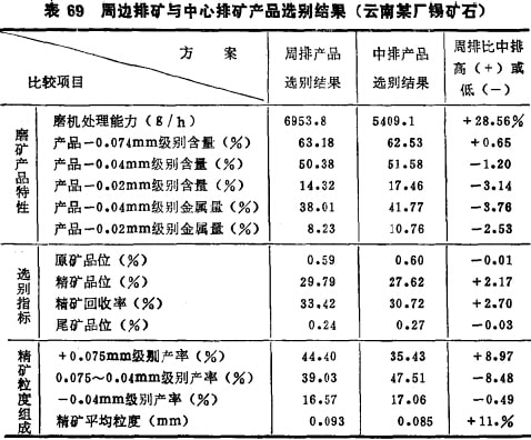 表71的結(jié)果是用廣西的錫礦石做的,重復(fù)體現(xiàn)了表69的結(jié) 論。表70則說(shuō)明,周邊排料棒磨機(jī)換為裝球以后仍然保持其優(yōu)越性,可見(jiàn)這神優(yōu)越性主要是磨機(jī)的排礦方式?jīng)Q定的。