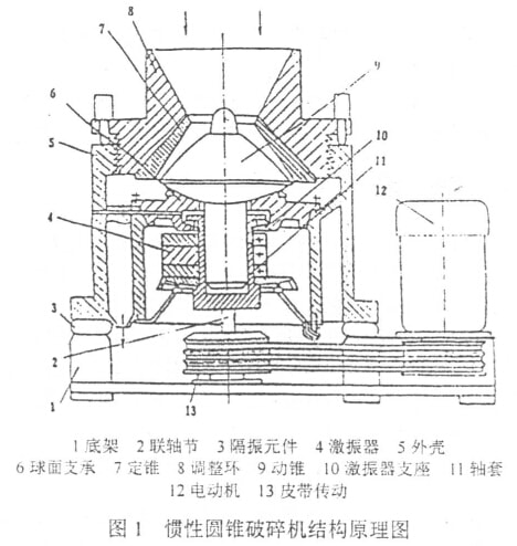 慣性圓錐破碎機(jī)的結(jié)構(gòu)如圖1所示。它的機(jī)體座落在隔振裝置上,工作機(jī)構(gòu)由定諧錐和動錐組成,錐體上均附有耐磨襯板,襯板之間的空間形成破碎胺。動錐軸插入軸套中,電動機(jī)的旋轉(zhuǎn)運動通過傳動機(jī)構(gòu)傳給固定在軸套上的激振器,激振器旋轉(zhuǎn)時產(chǎn)生慣性力,使動錐繞球面支承的球心做旋擺運動,動錐與傳動機(jī)構(gòu)之間無剛性聯(lián)接。當(dāng)破碎腔內(nèi)無物料時,動錐將沿定錐內(nèi)表面滾動。當(dāng)破碎腔內(nèi)有物料時,動錐將沿料層滾動,在滾動的同時隨物抖層厚度的變比伴隨有強(qiáng)烈脈動沖擊,從而對物抖進(jìn)行破碎。