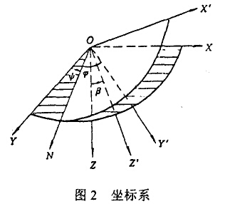 動錐與電機(jī)之間無剛性聯(lián)接,繞球面支承的球心O做旋擺運動,動錐相對于機(jī)體的運動力剛體繞定點O的轉(zhuǎn)動。以O(shè)點為原點,機(jī)體中心線為Z軸建立坐標(biāo)系OXYZ,另取以動錐軸線為Z′軸并與動錐固結(jié)的動坐標(biāo)系OX′Y′Z′,如圖2所示。動坐標(biāo)平面OX′Y′與定坐標(biāo)平面OXY的交線用ON表示,稱為節(jié)線,節(jié)線垂直于OZ和OZ′,節(jié)線與定軸OY間的夾角ψ稱為進(jìn)動角,節(jié)線與動錐OY′間的夾角φ稱為自轉(zhuǎn)角,動錐OZ′與定軸OZ間的夾角β稱為章動角,根據(jù)運動學(xué)原理,繞O運動的動錐相對于機(jī)體的位置用這三個角可以完全確定,因此,動錐相對于機(jī)體的運動是由以下三種旋轉(zhuǎn)運動組成。