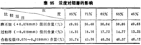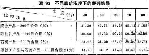 用純磁鐵礦與純石英混合料(各占50%)作各種磨礦濃度下的磨碎結(jié)果考察,結(jié)果列于表96。