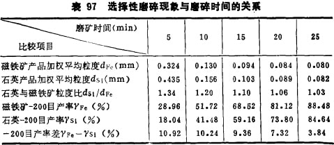 為了考查選擇性磨碎隨時(shí)間增長而減弱的現(xiàn)象,現(xiàn)采用磁鐵 礦與石英各占50%的混合礦料分別進(jìn)行5分、10分、15分、20分 及25分鐘的磨碎考査,結(jié)果列于表97。