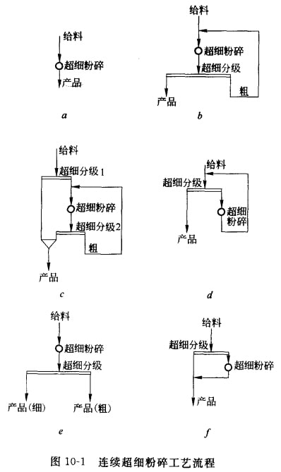 連續(xù)系統(tǒng)分為開(kāi)路和閉路系統(tǒng),其主要區(qū)別在于其是否有分級(jí)機(jī)配套形成閉路。圖10-1所示為各種連續(xù)超細(xì)粉碎工藝流程。