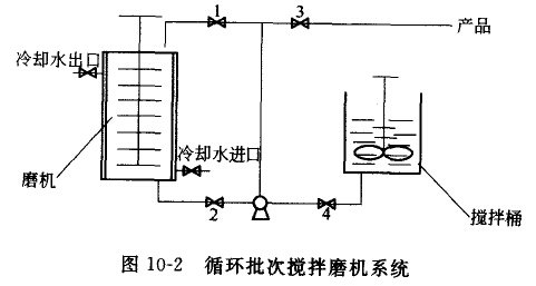 在濕式批次粉磨系統(tǒng)中,為避免泥漿粉磨時(shí)熱量的聚集、粉碎環(huán)境的惡化,可采用循環(huán)式批次系統(tǒng)。即泥漿泵將研磨中的泥漿泵出,經(jīng)冷卻器冷卻冉泵入磨機(jī)內(nèi),使磨機(jī)內(nèi)溫度降低,且強(qiáng)化了研磨中物料的混合,提高了產(chǎn)品粒度分布的均勻性。循環(huán)批次攪拌磨機(jī)如圖10-2所示。