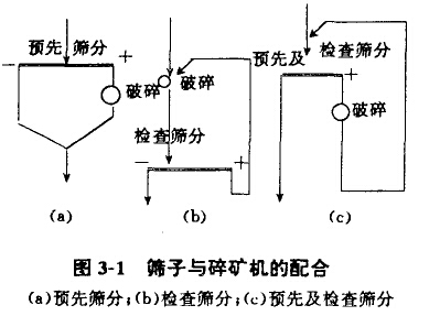 篩分是將礦石按粒度分成二種或多種級別的過程。篩分時(shí),通過篩孔的顆粒稱為篩下產(chǎn)品;未涌過篩孔的顆粒稱為篩上產(chǎn)品。在選礦廠采用的篩分作業(yè)有預(yù)先篩分和檢查篩分兩種。預(yù)先篩分是礦石進(jìn)入破碎機(jī)前的篩分。其目的是除去粒度已合格的產(chǎn)品,防止物料的過破碎和提高破碎機(jī)的生產(chǎn)能力。檢查篩分是礦石經(jīng)破碎后進(jìn)行的篩分。為了控制破碎產(chǎn)品的粒度,使不合格的產(chǎn)品返回破碎機(jī)再破碎,見圖3-1。