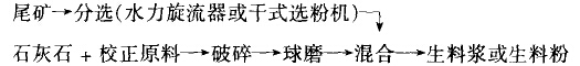 與普通的水泥制造方法一樣,尾礦水泥的生產(chǎn),仍采用“兩磨一燒”的工藝流程。但其工藝參數(shù)應(yīng)作適當(dāng)調(diào)整。以硅酸鹽水泥為例: