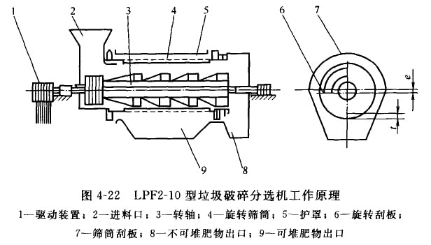 LPF2-10型垃圾破碎分選機(jī)工作原理如圖4-22所示。工作時(shí),轉(zhuǎn)軸與旋轉(zhuǎn)篩筒分別在各自驅(qū)動(dòng)裝置的帶動(dòng)下,同向差動(dòng)轉(zhuǎn)動(dòng)。根據(jù)垃圾中各組分耐沖擊、耐壓縮和耐剪切力的不同,利用選擇性破碎分選原理,在轉(zhuǎn)軸刮板的撞擊、剪切作用下,將垃圾中能破砷的組分破碎,通過篩筒篩出,輸往后續(xù)系統(tǒng);不能破碎的組分就從旋轉(zhuǎn)篩筒木端排出機(jī)外,從而達(dá)到在一機(jī)內(nèi)同時(shí)進(jìn)行破碎和篩分的目的。