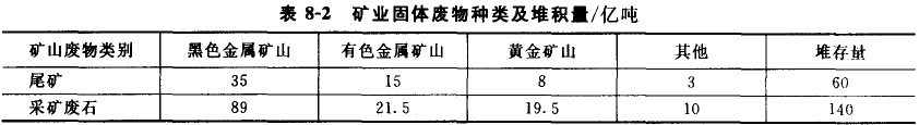 據(jù)統(tǒng)計(jì),我國礦業(yè)廢物的堆存望已達(dá)200余億噸(表8-2),占我國工業(yè)固體廢物堆積量的85%以上,并以2-3億噸的速度逐年增長。目前年排放尾礦約5億噸、采礦廢人4億噸、煤殲石1.5億噸、赤泥500萬噸、冶煉渣450萬噸。這些礦業(yè)廢物苦處理、處置不當(dāng),不僅侵占土地,給生態(tài)環(huán)境和人身健康造成嚴(yán)重危害,還格加劇排L場滑坡、泥石流、尾礦庫潰壩等工程災(zāi)害,浪費(fèi)有價(jià)資源,污染周圍水體、土壤和大氣,破壞生態(tài)植被、導(dǎo)致土地退化及沙漠化等一系列問題。