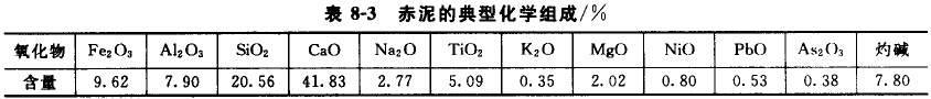 赤泥是制鋁工業(yè)從鋁上礦中提煉氧化鋁后殘留的一種紅色、粉泥狀、高含水量的強堿性固體廢料,密度0.7-1.0t/m3,比表面積0.5-0.8m2/g。赤泥的組成和性質復雜,并隨礦石成分、氧化鋁生產工藝,及赤泥的脫水、陳化程度有所變化,其典型化學成分如表8-3所示。