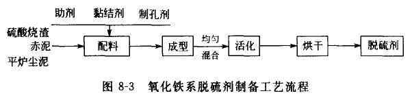 拜爾法赤泥中含有赤鐵礦(α—Fe2O3)和針鐵礦(α—FeOOH)、一水硬鋁石(Al203·H2O)、含水硅鋁酸鈉(Na2O·Al2O3·1.73SiO2·1.73H2O)、方解石(CaCO2)等物相,經熱處理后可形成多孔結構,比表面積可達40-70m2/g,因此,在硫化氫廢氣污染治理上,可利用其較佳的吸附性能,和硫酸燒渣、平爐塵等一道為主要原料(含員78%-88%)制備廉價的氧化系脫硫劑,其工藝流程如圖8-3所示。