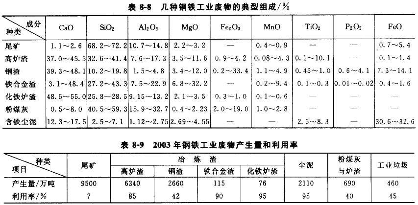 隨著鋼鐵工業(yè)的蓬勃發(fā)展,近幾年我國鋼鐵產(chǎn)量已穩(wěn)居世界首位,2003年我國鋼產(chǎn)量已達(dá)到2.2億噸,接近世界總產(chǎn)量的20%;但同時(shí)也排放了約1.7億噸的廢物,包括開采廢石、選礦尾礦、高爐渣、鋼渣、鐵合金渣、含鐵塵泥、粉煤灰等,其典型組成如表8-8所示。