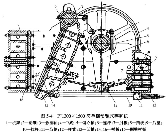 簡(jiǎn)擺顎式破碎機(jī)主要是由機(jī)架和支承裝置,碎礦的工作機(jī)構(gòu),傳動(dòng)機(jī)構(gòu),保險(xiǎn)裝置及徘礦口調(diào)整裝置等幾部分組成。