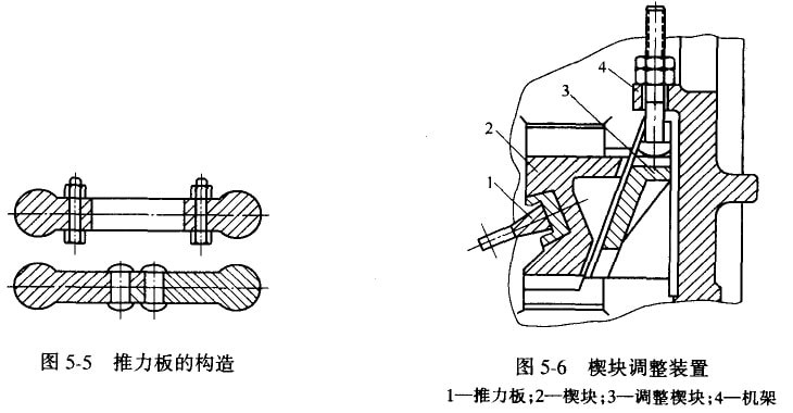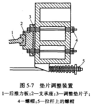 (2)墊片調(diào)整裝置。如圖5-7所示,在后推力板1的支承座2后面放入一組厚度相同的墊片3,改變墊片的數(shù)量,即可達(dá)到調(diào)整徘礦口大小的目的。在調(diào)整排礦口時(shí),要先特螺帽4及拉桿彈簧螺帽5松開(kāi),然后增加或減少墊片的數(shù)目,待排礦口調(diào)整好后,再將螺帽4上緊,并調(diào)整彈簧上的螺帽5。用此法可以達(dá)到多級(jí)調(diào)整,調(diào)整時(shí)也比較方便,同時(shí)可以使機(jī)器結(jié)構(gòu)緊湊和質(zhì)量減小。但調(diào)整時(shí)必須停車(chē)。這種方法常用在大、中型碎礦機(jī)上。