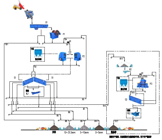 400t/h石灰石(白云巖)類巖石的砂石骨料生產(chǎn)線,將經(jīng)過爆破處理或開挖洞采的毛料通過棒條給料機(jī)均勻的供給顎式破碎機(jī)進(jìn)行粗碎,經(jīng)顎式破碎機(jī)破碎后的半成品物料通過皮帶機(jī)輸送給反擊式破碎機(jī)進(jìn)行二次破碎,經(jīng)反擊破二次破碎后的混合骨料經(jīng)過皮帶機(jī)輸送至后續(xù)一篩車間進(jìn)行分級篩分,篩分過后將大于用戶需要的大顆粒物料再通過皮帶機(jī)重新返回反擊式破碎機(jī)循環(huán)破碎,篩分過后滿足客戶需要的不同顆粒級別的成品通過出料皮帶機(jī)輸送至成品料倉。如果成品砂需要水洗也可以配置洗砂機(jī)用于成品砂的水洗。該系統(tǒng)的棒條給料機(jī)還具有預(yù)篩分功能,可以將原料中的細(xì)顆粒物料提前分離直接進(jìn)入后續(xù)的破碎設(shè)備,也可將原料中的泥土雜物作為棄料預(yù)先分離。