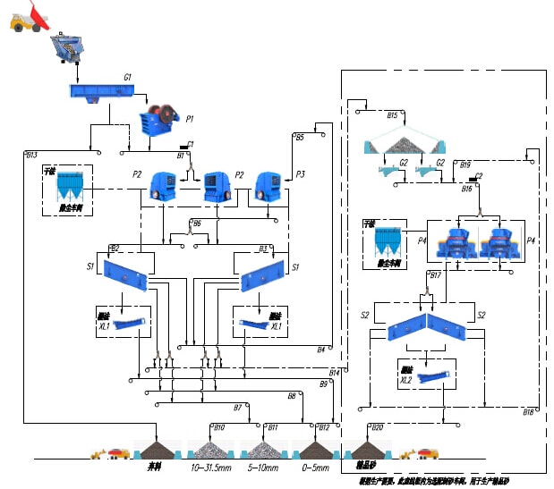 該生產(chǎn)線生產(chǎn)工藝適用于產(chǎn)量600t/h噸石灰石(白云巖)類中等以下硬度物料的加工破碎,將經(jīng)過爆破處理或開挖洞采的毛料通過棒條給料機(jī)均勻的供給顎式破碎機(jī)破碎,經(jīng)顎式破碎機(jī)破碎后的半成品物料通過皮帶機(jī)輸送給反擊式破碎機(jī)進(jìn)行二次破碎,經(jīng)反擊破二次破碎后的混合骨料經(jīng)過皮帶機(jī)輸送至一篩車間進(jìn)行分級(jí)篩分,篩分過后將大于用戶需要的大顆粒物料通過皮帶機(jī)輸送至細(xì)碎反擊式破碎機(jī)再進(jìn)行破碎,破碎后的物料再通過皮帶機(jī)也輸送至一篩車間進(jìn)行篩分,篩分過后的不同顆粒級(jí)別的成品通過成品出料皮帶機(jī)輸送至成品料倉。不符合要求的大顆粒再次返回細(xì)碎反擊式破碎機(jī)進(jìn)行循環(huán)破碎。如果成品砂需要水洗也可以配置洗砂機(jī)用于成品砂的水洗,該系統(tǒng)的棒條給料機(jī)還具有預(yù)篩分功能,可以將原料中的細(xì)顆粒物料提前分離直接進(jìn)入后續(xù)的破碎設(shè)備,也可將原料中的泥土雜物作為棄料預(yù)先分離。