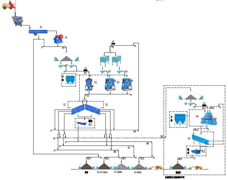 該系統(tǒng)示意工藝適用于時(shí)產(chǎn)500噸花崗巖、玄武巖類硬性物料的加工破碎,將經(jīng)過爆破處理或開挖、洞采的小于1250mm大塊毛料通過自卸車上料至原料倉,經(jīng)過具有預(yù)篩分功能的棒條給料機(jī)均勻的供給顎式破碎機(jī)破碎,經(jīng)顎式破碎機(jī)破碎后100-250mm的半成品物料通過皮帶機(jī)輸送給具有中細(xì)碎功能的圓錐破碎機(jī)進(jìn)行二次破碎,經(jīng)圓錐破碎機(jī)二次破碎后6-45mm的混合成品骨料經(jīng)過皮帶機(jī)輸送至后續(xù)一篩車間進(jìn)行分級(jí)篩分,篩分將大于用戶需要的大顆粒物料再通過皮帶機(jī)輸送至細(xì)碎圓錐破碎機(jī)進(jìn)行破碎,破碎后的物料也進(jìn)入一篩車間進(jìn)行篩分,滿足客戶需要的合格成品通過皮帶機(jī)輸送至成品料倉,不符合要求的大顆粒再次返回細(xì)碎圓錐破碎機(jī)進(jìn)行循環(huán)破碎。