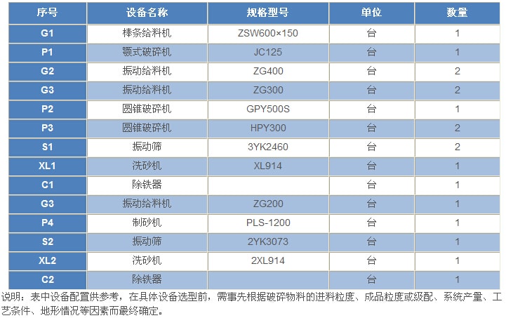 500t/h---花崗巖(玄武巖)類巖石的砂石骨料生產(chǎn)工藝設(shè)備配置表