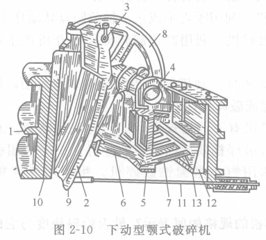 下動(dòng)型顎式破碎機(jī)在選礦廠用得最多。其結(jié)構(gòu)如下圖所示。