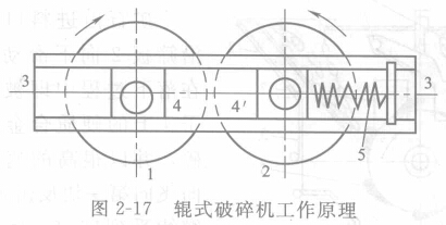 下圖為輥式破碎機(jī)的結(jié)構(gòu)及工作原理。輥1安裝在機(jī)架3上的固定軸承4上,輥2則被可動(dòng)軸承4所支持。兩個(gè)輥?zhàn)臃謩e用兩個(gè)電動(dòng)機(jī)帶動(dòng),并作相向轉(zhuǎn)動(dòng)。礦石出上部給入,破碎是在兩個(gè)輥?zhàn)娱g形成的空隙中進(jìn)行的。金屬礦山由于多使用光滑輥面,所以破碎作用主要是靠壓碎,計(jì)附帶有些研磨作用(當(dāng)為齒面時(shí)則上要靠劈碎作用)。破碎后的物料借重力自行排出。這種破碎機(jī)的特點(diǎn)是由于物料通過(guò)兩個(gè)輥?zhàn)又虚g時(shí)只受壓一次,所以過(guò)粉碎現(xiàn)象少。