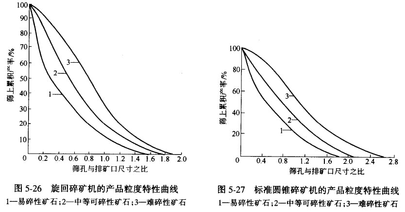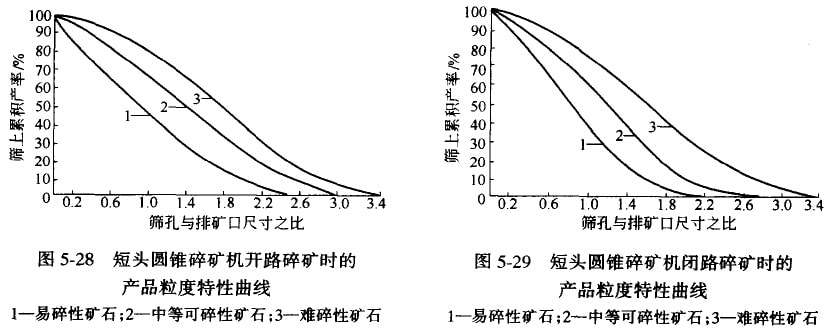 旋回碎礦機(jī)和標(biāo)準(zhǔn)型圓錐碎礦機(jī)的產(chǎn)品粒度特性曲線,分別如圖5-26及圖5-27所示,短頭型圓錐碎礦機(jī)在開路和閉路碎礦時(shí)的產(chǎn)品粒度特性曲線,分別如圖5-28及圖5-29所示。所有碎礦機(jī)的產(chǎn)品粒度特性曲線的意義和用途都相同,在前面已作過介紹,在此不重述。