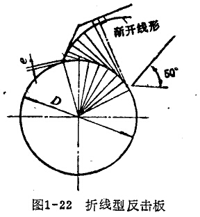 反擊板是反擊式破碎機的主要部件。反擊扳的型式有折線型和弧線型兩類。漸開線型反擊板(圖1-22)的主要特點是:物料以垂直于反擊板的方向沖擊到反擊板上,因此可獲得最佳的破碎效果。但是由于漸開線型反擊面制作困難,而且實際破碎時,由于料塊在腔內(nèi)相互間的干擾,其運行軌跡已不規(guī)則,故通常采用近似漸開綏的折線型反擊板代之。