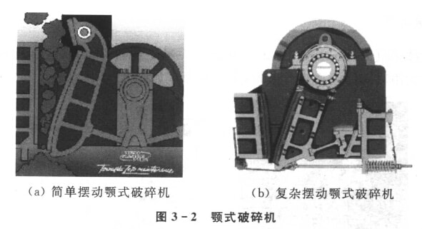 顎式破碎機(Jaw Crusher)俗稱“老虎口”,廣泛用于選礦、建材、硅酸鹽和化學工業(yè)部門。如圖3-2所示,顎式破碎機有簡單擺動式和復雜擺動式兩種類型。