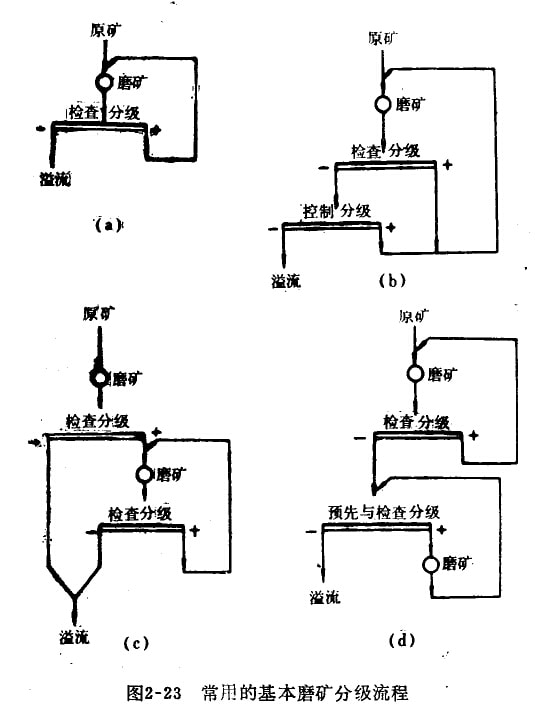 選礦廠常用的基本磨礦分級(jí)流程主要有四種,如圖2—23所示。在磨礦分級(jí)流程中的分級(jí)作業(yè),依其在流程中所起的作用,可分為預(yù)先分級(jí)、檢查分級(jí)和控制分級(jí)三種。