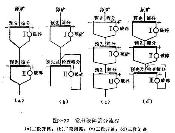 三段開路流程見圖2-22(c)。該種流程用于處理含水高的泥質(zhì)礦心及易產(chǎn)生大量ZJ英項(xiàng)礦塵礦石的大、中型選礦廠。其優(yōu)點(diǎn)可以簡化破碎車間設(shè)備配出礎(chǔ)少基建投資。其缺點(diǎn)是產(chǎn)品粒度較大。