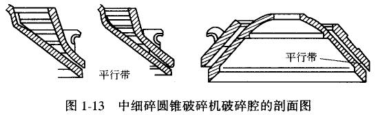 中細(xì)碎圓錐破砷機(jī)可分為彈簧型圓錐破碎機(jī)及液壓型圓錐破碎機(jī)兩種。液壓型圓錐破碎機(jī)又有單缸及多缸兩種。多缸液壓圓錐破碎機(jī),由于油路比較復(fù)雜,而且工作沒有單缸液壓的可靠,因此在目前已經(jīng)不再制造了,只有在已有這種設(shè)備的廠礦中才能見到。以上兩種圓錐破碎機(jī),每種又可分為標(biāo)準(zhǔn)型、中間型及短頭型三種。這三種型式破碎機(jī)的基本構(gòu)造和工作原理完全相同,只是在破碎腔的形狀略有不同,如圖1-13所示。