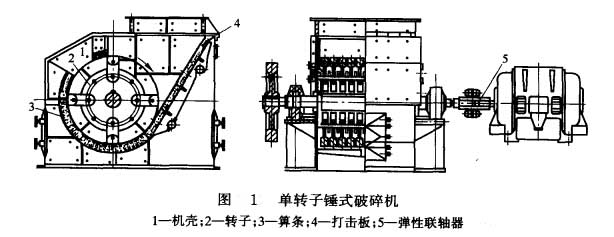 錘式破碎機(jī)主要由機(jī)殼1,轉(zhuǎn)子2、箅條3和打擊板4等部件組成見圖1,機(jī)完分上下兩部分,系鋼板焊接件,機(jī)殼內(nèi)壁鑲有高錳鋼襯板,襯板磨損后可以更換。