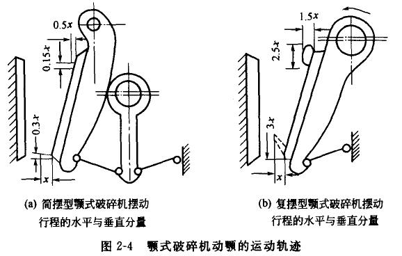 顎式破碎機(jī)動(dòng)顎的運(yùn)動(dòng)軌跡示于圖2-4。在簡(jiǎn)擺型顎式破碎機(jī)中,動(dòng)顎以心軸為中心而擺動(dòng)一段圓弧,其下端的擺動(dòng)行程較大,上端較小。擺動(dòng)行程可分為水平的與垂直的兩個(gè)分量,視機(jī)構(gòu)的幾何關(guān)系而定,其比例大致如圖2-4(a)所示。復(fù)擺型顎式破碎機(jī)的運(yùn)動(dòng)軌跡較為復(fù)雜,動(dòng)顎上端的運(yùn)動(dòng)軌跡近似為圓形,下端的運(yùn)動(dòng)軌跡近似為橢圓形。其行程的水平與垂直分量的比例大致如圖2-4(b)所示。簡(jiǎn)擺型與復(fù)擺型顎式破碎機(jī)動(dòng)顎運(yùn)動(dòng)的另一個(gè)區(qū)別,就是在簡(jiǎn)擺型中,動(dòng)顎上端與下端同時(shí)靠近固定顎或遠(yuǎn)離固定顎,即動(dòng)顎上端與下端的運(yùn)動(dòng)是同步的;而在復(fù)擺型中,動(dòng)顎上端與下端的運(yùn)動(dòng)是異步的,例如,當(dāng)動(dòng)顎上端朝向固定顎運(yùn)動(dòng),下端卻向相反于固定顎的方向運(yùn)動(dòng)。換句話(huà)說(shuō),在某些時(shí)刻,動(dòng)顎上端正在破碎物料,下端卻正在排出物料,或反之。