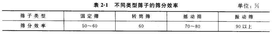 篩子運(yùn)動(dòng)方式對(duì)篩分效率有較大的影響,不同類型的篩分設(shè)備,其篩子運(yùn)動(dòng)方式不同,其篩分效率亦不同。同一種固體廢物采用不同類型的篩子進(jìn)行篩分時(shí),其篩分效率大致如表2-1所示。