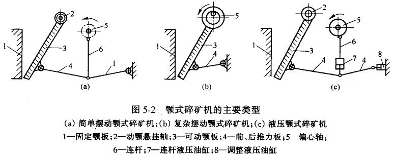 顎式破碎機(jī)的類型很多,目前在我國選礦廠中使用最廣的主要有簡單擺動(dòng)顎式破碎機(jī)(如圖5-2a)和復(fù)雜擺動(dòng)顎式破碎機(jī)(如圖5-2b)兩種類型。這兩種顎式破碎機(jī)的工作原理基本上是相似的,只是動(dòng)顎的運(yùn)動(dòng)軌跡有較大的差別。近年來,由于液壓技術(shù)的應(yīng)用,在簡單擺動(dòng)顎式破碎機(jī)的基礎(chǔ)上制成了液壓顎式破碎機(jī),如圖5-2c所示,在選礦廠也開始應(yīng)用。