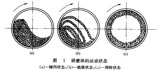 由于磨機轉速的變化。一定量的研磨體可出現三種情況。磨機轉速太快,研磨體與物料粘附筒體一起回轉,稱為"周轉狀態(tài)",研磨體對物料起不到沖擊和研磨作用。當磨機轉速太慢,研磨體和物料因摩擦力的作用被簡體帶到等于動摩擦角的高度時,研磨體和物料就下滑,稱為"傾瀉狀態(tài)"。對物料有研磨作用而沒有沖擊作用,粉磨效率不高。當磨機轉速適中時,研磨體提升到一定高度后拋落下來、稱為"拋落狀態(tài)",研磨體對物料有較大的沖擊和研磨作用,粉磨效率高。參見圖l。