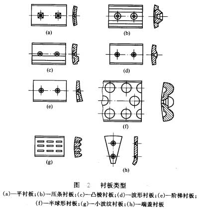 常用襯板的形狀見圖2,形狀較平滑的襯板使鋼球同襯板之間的相對滑動較大,產生鉸多的研磨作用,在相同轉速下鋼球被提升的高度和拋射所耗的功較少,適于細磨。凸起部較高的襯板對鋼球的推舉作用強,使鋼球能升至較高的位置,沖擊作用較強。橡膠襯板耐磨損(壽命比猛鋼材板高2—3倍)重量輕(比錳鋼襯板輕約85%)、拆裝方便、噪聲小。