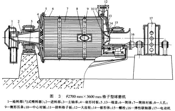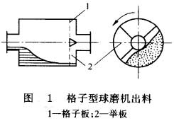 另一種球磨機是在出料端附近有格子板。格子板由若干塊扇形板組成,扇形板上有寬度為8—20mm的篩孔,物料可通過篩孔而聚集在格子板與右端蓋之間的空間內。此空間內有若干塊輻射狀的舉板。筒體轉動時.舉板將物料向上提舉,物料下落時經過錐形塊而向出料端折轉,經右端中空軸排出。由于格子板和舉板的作用,物料在出料端的料位較低,使排料加快,生產量提高,參見圖1。