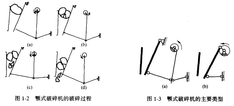 加入到顎式破碎機(jī)破碎腔(由固定顎板和可動(dòng)顎板組成的空間)中的物料,由于動(dòng)顎板作周期性往復(fù)擺動(dòng),當(dāng)動(dòng)顎板靠近固定顎板時(shí),物料受到擠壓、劈裂和折斷的作用而破碎。當(dāng)動(dòng)顎板離開(kāi)固定顎板時(shí),已碎到小于排礦口的物料,靠其自重從下部徘礦口排出。位于破碎腔上還未完全破碎的物料,也隨之下落到破碎腔下部,冉次受到顎板的擠壓,劈裂和折斷的作用而繼續(xù)破碎。圖1—2為一大塊物料在顎式破碎機(jī)中被破碎的過(guò)程。圖1—2(a)是活動(dòng)頃張到最大位置。即活動(dòng)顎離固定顎最遠(yuǎn)的位置,此時(shí)物料進(jìn)入破碎腔。固1—2(b)是活動(dòng)顎逐漸向固定顎靠近,物料受擠壓產(chǎn)生裂縫而破碎。圖1—2(c)是活動(dòng)顎靠到離固定顎最近時(shí)的位置,壓裂了的物料被分成幾個(gè)小塊。圖1—2(d)是活動(dòng)顎又張到最大位置,被破碎了的物料由于自重而下落。小于排礦口的物料從破碎胺中誹出,大于排礦口的物料落至破碎腔的下部,與新進(jìn)入破碎腔的物料一起再次受到破碎。