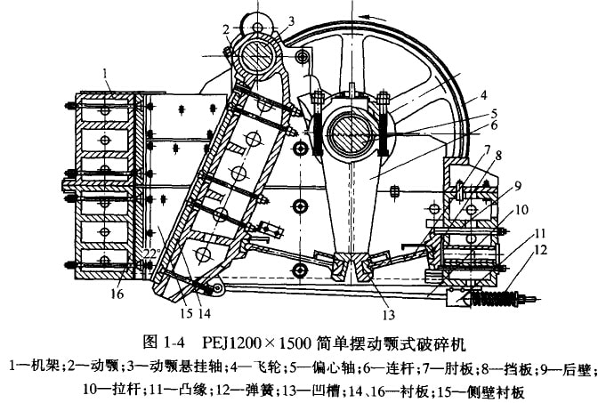 圖l—4是我國(guó)沈陽(yáng)重型機(jī)器廠生產(chǎn)的四1200 x1500簡(jiǎn)單擺動(dòng)顎式破碎機(jī)的剖視圖。機(jī)架1是顎式破碎機(jī)的骨架,所有其他零部件都安裝在它的上面。帶有襯板16的固定顎板裝在機(jī)架l的前壁上。機(jī)架的上面裝有兩對(duì)互相平行的軸承.在第——對(duì)軸承中安裝著軸3,帶有襯板14的動(dòng)顎2固定在該軸上,并利用軸3及其軸承懸扶在機(jī)架上,因此軸3叫做動(dòng)顎懸掛軸。在第二對(duì)軸承中裝有偏心抽5和安故在軸上的洼桿60在偏心軸的兩端分別安裝著飛輪或皮帶輪4。連桿的下端有凹槽13,肘板7的一端伸人到此槽內(nèi),前肘板的另一端支承在動(dòng)顎下部的凹楷內(nèi)、后肘板的另一端支承在機(jī)器后壁9相連的特殊擋板8上的凹槽內(nèi)。水平拉桿10的一端鉸接在動(dòng)顎下端的耳環(huán)k、它的另一端用彈簧12支持在機(jī)架后壁凸絳11上,由于拉桿和彈簧的作用,使動(dòng)顎下瑞經(jīng)常向機(jī)架后壁方向拉緊,因而在動(dòng)顎張開(kāi)時(shí)肘板不至脫落下來(lái)。