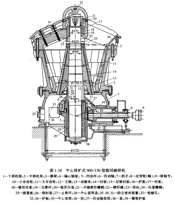 圖1—10是國產(chǎn)的900/150型中心排礦式旋回破碎機(jī),它由機(jī)架、偏心抽套、主軸和動(dòng)錐、懸掛裝置及傳動(dòng)機(jī)構(gòu)等部分所組成。