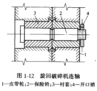 旋回破碎機(jī)的保險(xiǎn)裝置,主要是利用連接傳動(dòng)蝕和三角皮帶輪的聯(lián)細(xì)節(jié)土的保險(xiǎn)銷,當(dāng)過負(fù)荷時(shí)或破碎機(jī)中落人大塊非破碎物時(shí)(如電鏟齒),保險(xiǎn)銷即被招斷,達(dá)到保險(xiǎn)的日的。其裝置如圖1—12所示,它由四個(gè)保險(xiǎn)銷組成,裝在聯(lián)軸節(jié)上,用以連接傳動(dòng)軸和i角皮帶輪。