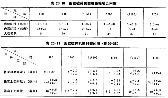 安裝旋回式破碎機(jī)和圓錐破碎機(jī)偏心軸套部時(shí),應(yīng)特別洽態(tài)調(diào)整好齒輪的嚙合性能。圓錐齒輪的接觸面積應(yīng)占齒寬和齒長(zhǎng)的50%左右,安裝后齒頂間隙(在齒外端測(cè)量)一般應(yīng)為(0.2—0.3)m,m為模數(shù)。表20—10是圓錐破碎機(jī)的合理齒輪嚙合間隙。