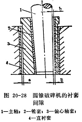 圓錐破碎機(jī)偏心軸套3(圖20—28)與機(jī)架直襯套4的間隙a的大小,以及主軸1與其錐套2的上下間隙b與B的大小可見(jiàn)表20—11。這些間隙極為重要,過(guò)大會(huì)引起工作不正常,過(guò)小會(huì)引起發(fā)熱甚至?xí)l(fā)d:抱勃事故。間隙a上下一樣;但主軸與錐套的間隙必須保證上小下大(即b小B大),因?yàn)橹挥羞@樣才能保證主軸繞其軸線上一點(diǎn)作旋回?cái)[動(dòng)。